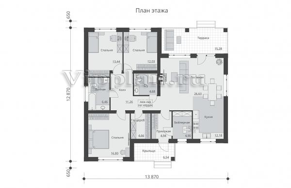| Размеры дома: | 12.87м×13.87м |